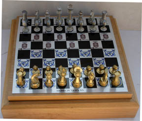 Each squere has either a an anchor pair or an Army knight. The playing surface is made of steel. The pieces are made of polished solid pewter,one side