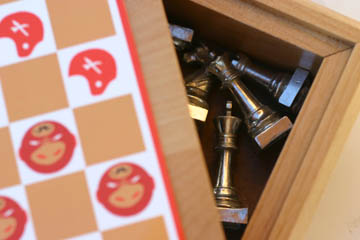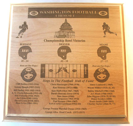 DESCRIPTIONThe top of the laser engraved alder wood top is engraved with the Washington championship Bowl winning history along will the names of all players who are in the Hall Of Fame. On the flip side of the alder box is the Washington chessboard, see picture on the right. It is also laser engraved, but unlike the top it is made of steel.Each square on the board is the image of a football helmet. The dimensions of the unit is 10” by 10" by 3".” The height of the king is 2 inches. |